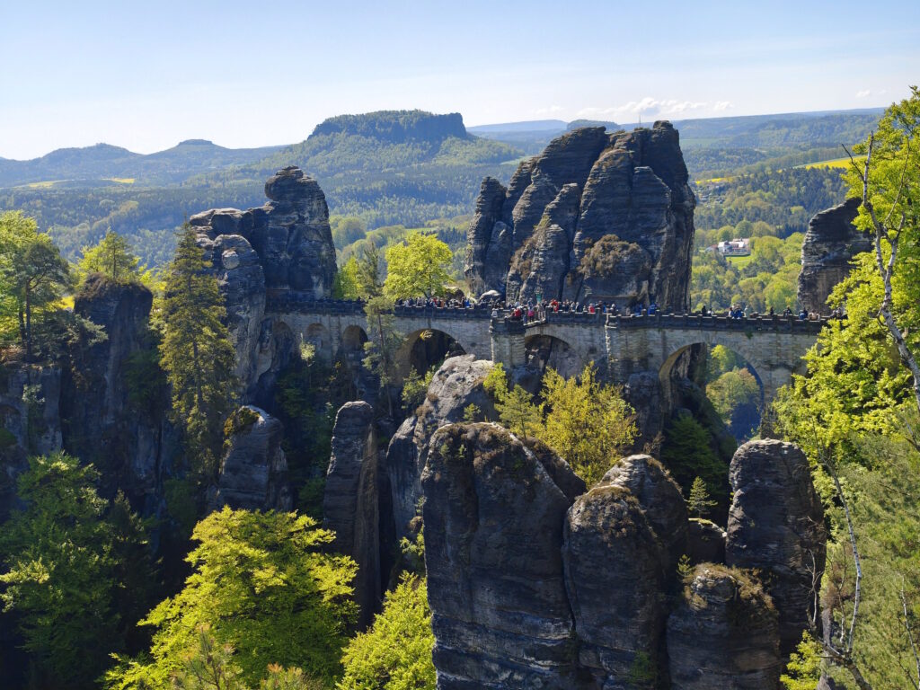 Von Rothenburg ob der Tauber zur Basteibrücke beträgt die Strecke ca. 438 Kilometer. Rechne vom berühmten Plönlein in Rothenburg ungefähr 4,5 Stunden reine Fahrzeit)